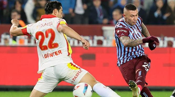 Trabzonspor gole yaklaştı… Sağ kanattan gelen ortayı Onuachu kafayla indirdi, penaltı noktası üzerinden Visca voleyi vurdu, top üstten dışarı gitti.