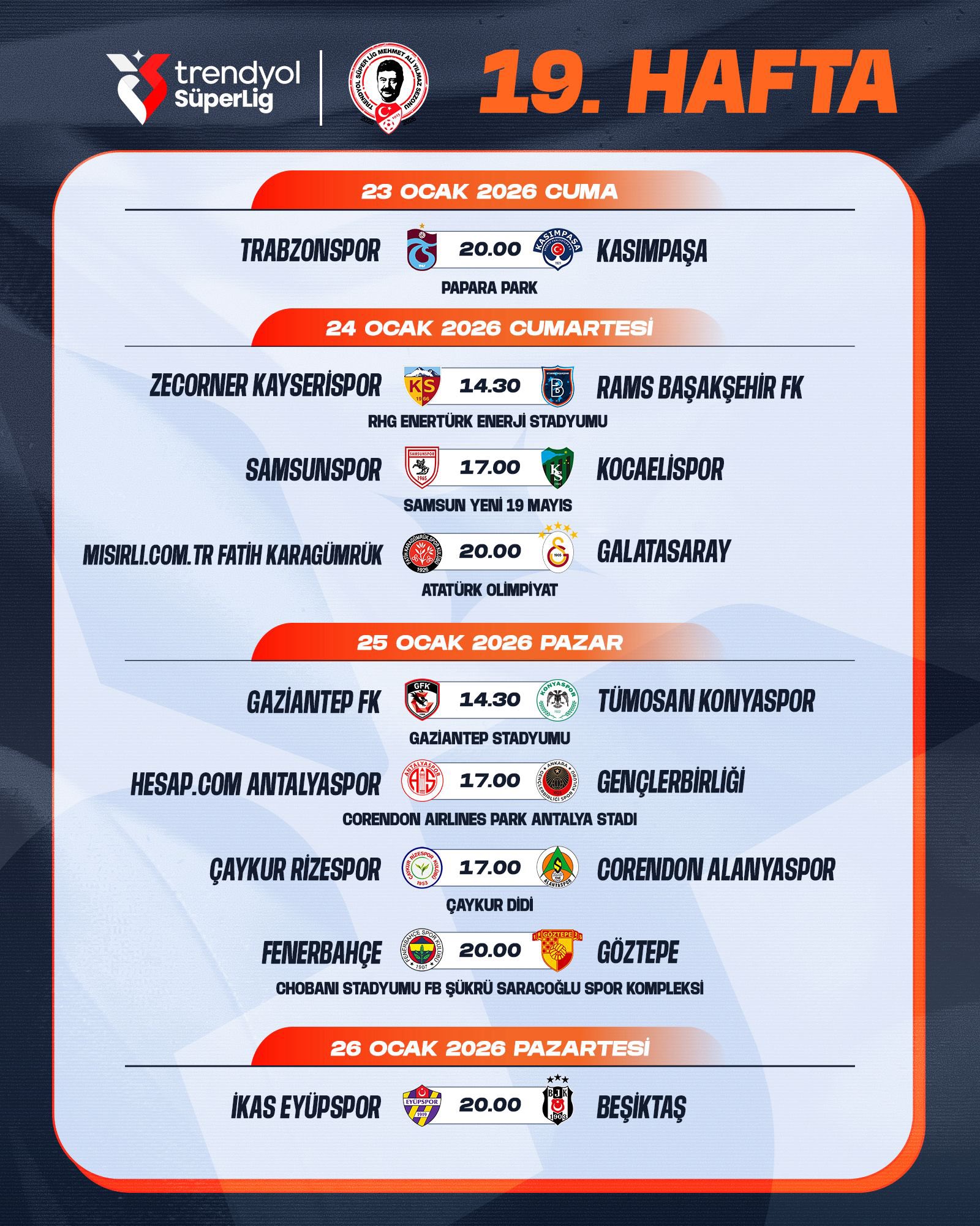 Posted inSüper Lig Trendyol Süper Lig’de 18. ve 19. hafta programı açıklandı! Posted by haberdefteri Aralık 22, 2025No Comments TFF, Trendyol Süper Lig’in 18. ve 19 haftasında oynanacak karşılaşmaların programını açıkladı. Federasyondan yapılan açıklamaya göre fikstür şu şekilde: haberdefteri View All Posts Post navigation Previous Post Anadolu Efes’in İsrail takımıyla oynayacağı maçın yeri belli oldu!Next PostTrendyol 1. Lig’de 20-22. haftaların programı açıklandı